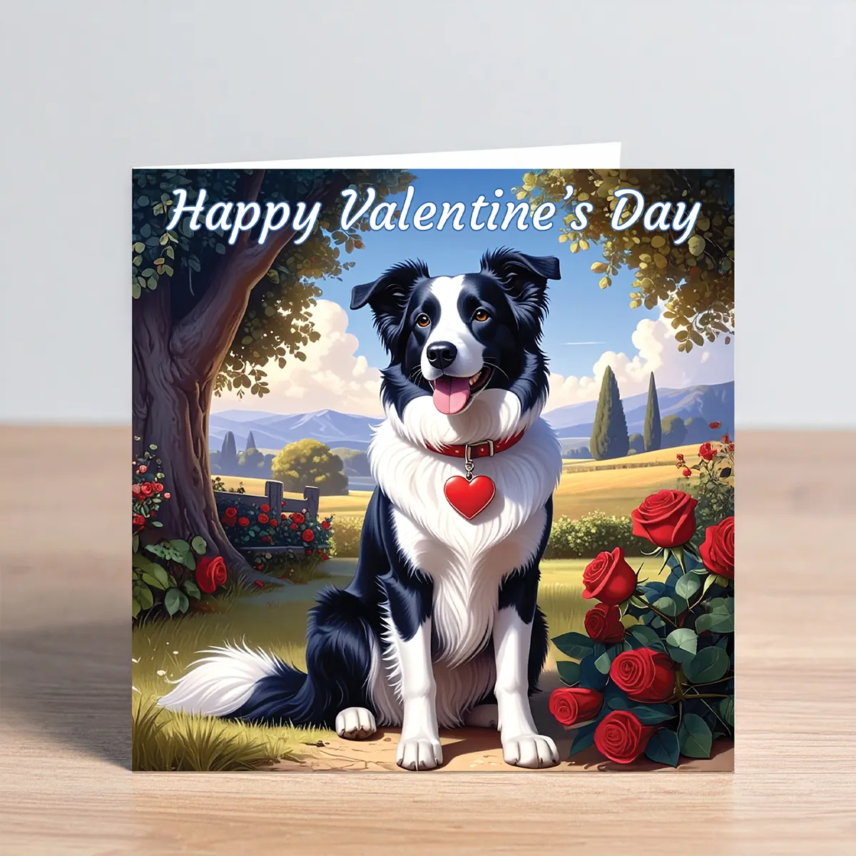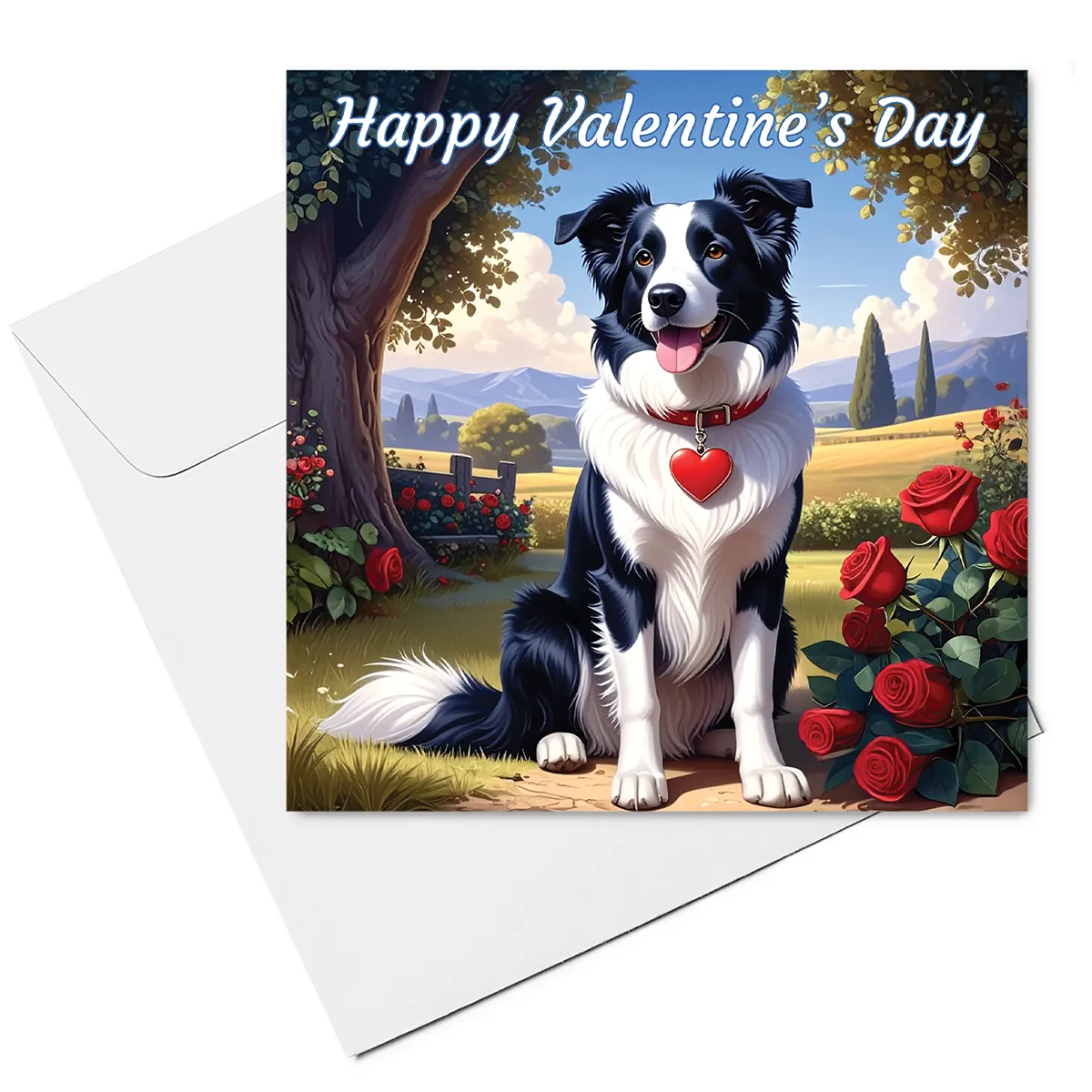 Send romantic greetings with this charming Border Collie Valentine’s Day Card featuring a Border Collie sitting in a peaceful countryside setting. The Border Collie wears a red collar with a heart-shaped pendant and sits beneath a shady tree, surrounded by red roses and rolling fields with distant hills and trees under a bright blue sky, creating a warm and romantic scene.