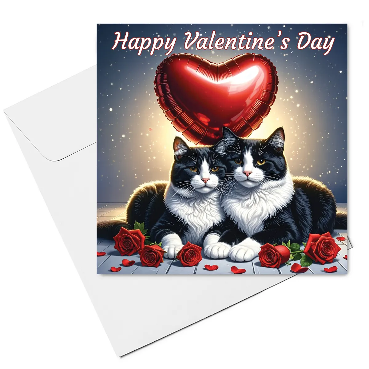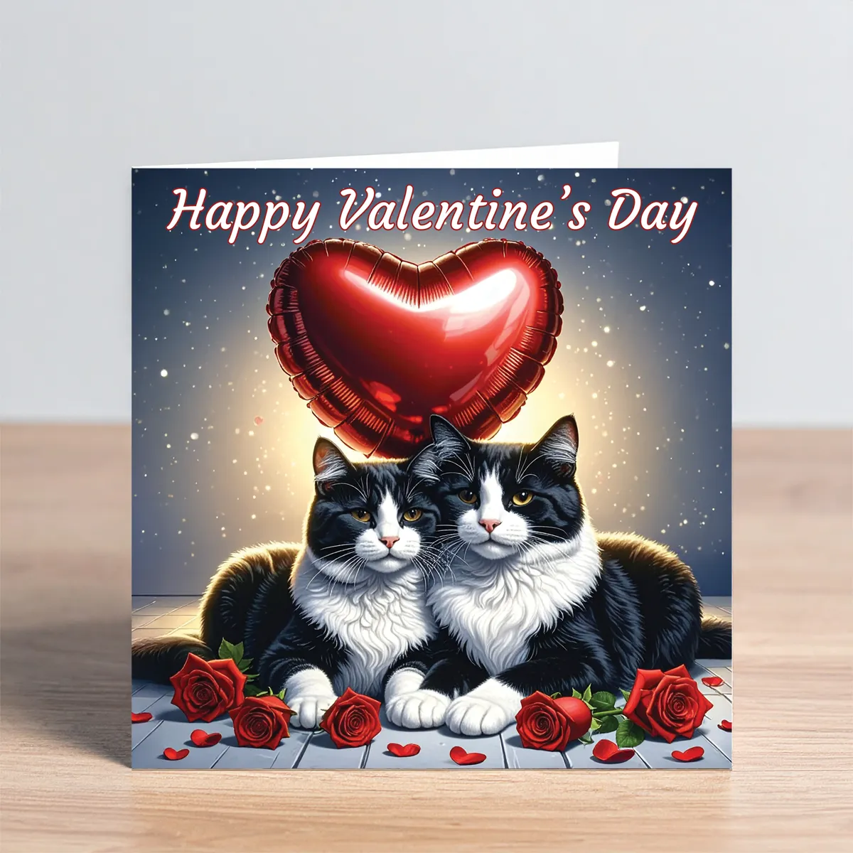 Share some Valentine’s Day love with this adorable Cat Valentine’s Day Card featuring two black and white tuxedo cats cuddled together beneath a red heart-shaped balloon. Surrounded by red roses and scattered heart-shaped confetti against a softly glowing background, this Cat Valentine’s Day Card creates a romantic and cosy scene that is perfect for celebrating Valentine’s Day.