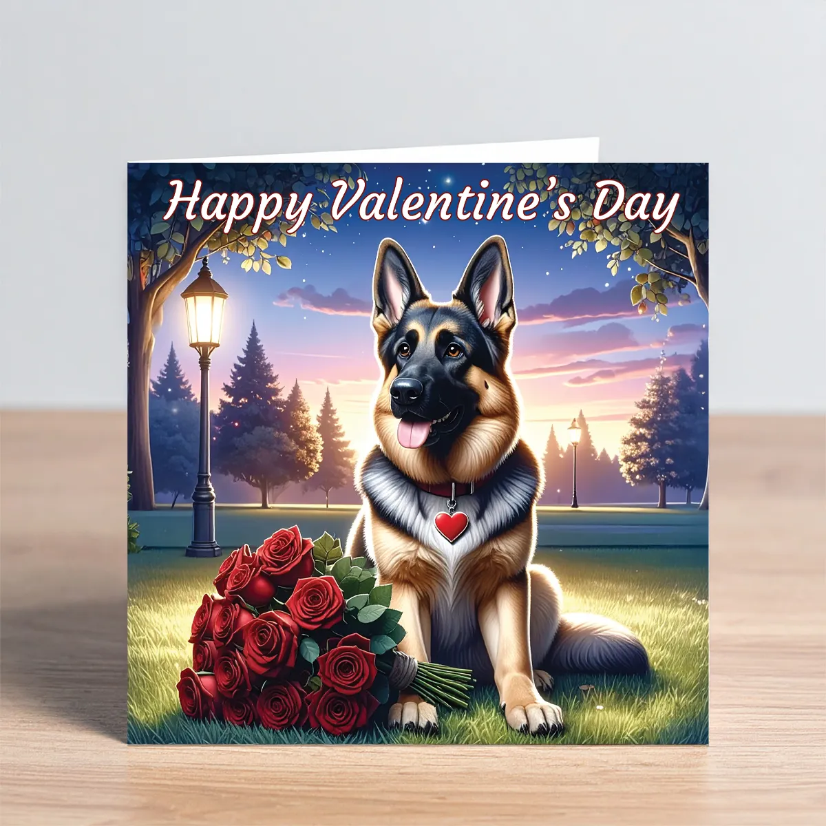 Share some loving vibes this Valentine’s Day with this charming German Shepherd Valentine Card featuring a German Shepherd sitting on the grass in a peaceful park at sunset. The German Shepherd wears a red heart-shaped tag on its collar and sits beside a bouquet of deep red roses, with soft evening light, trees, and glowing lampposts creating a romantic backdrop.