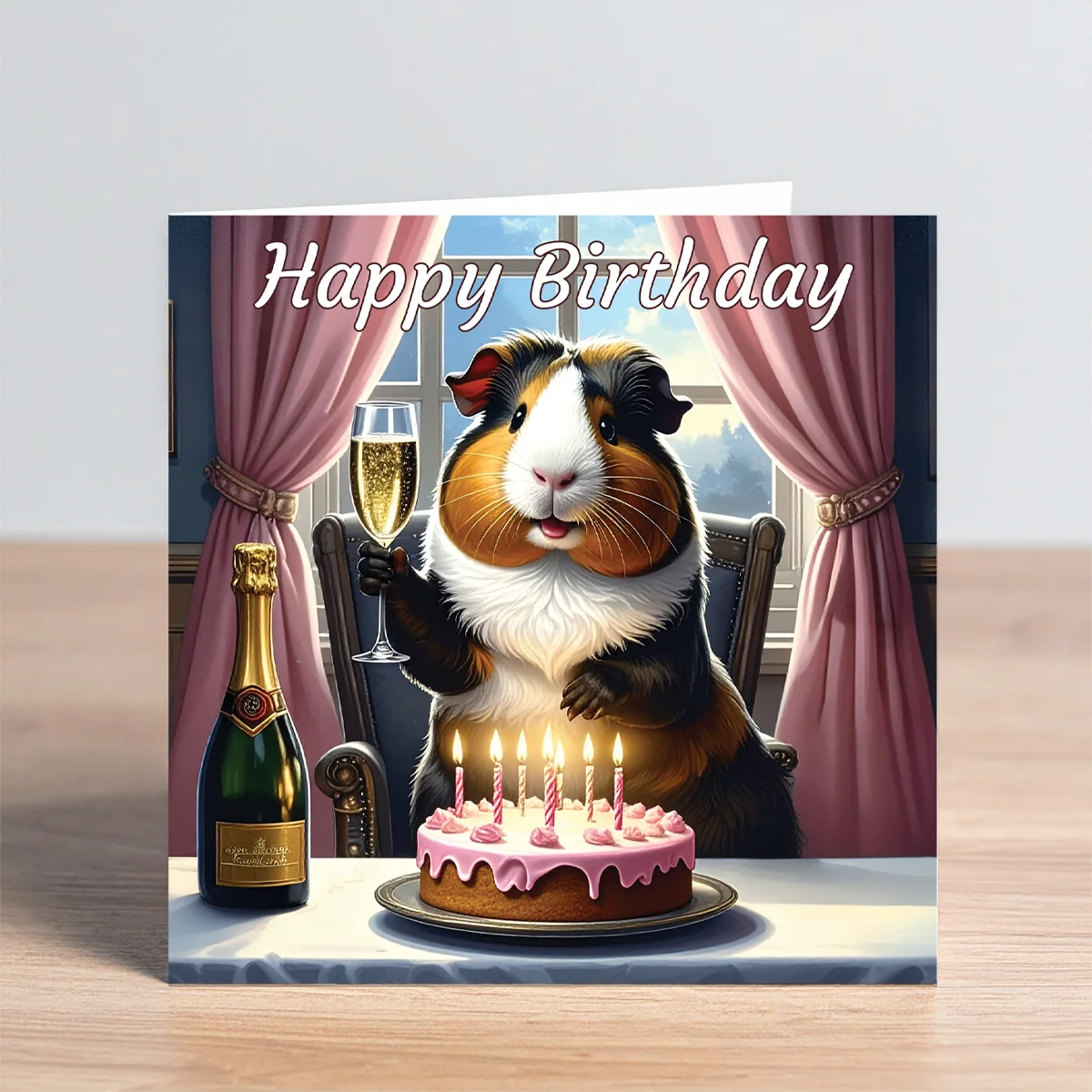 Celebrate a birthday with this charming Guinea Pig Birthday Card featuring a tricolour guinea pig sitting at a table with a pink iced birthday cake topped with lit candles. The guinea pig holds a glass of champagne, with a bottle placed nearby, creating a fun and celebratory scene. Set against a cosy indoor backdrop with soft lighting and elegant curtains framing a window, the design creates a warm and inviting birthday atmosphere.