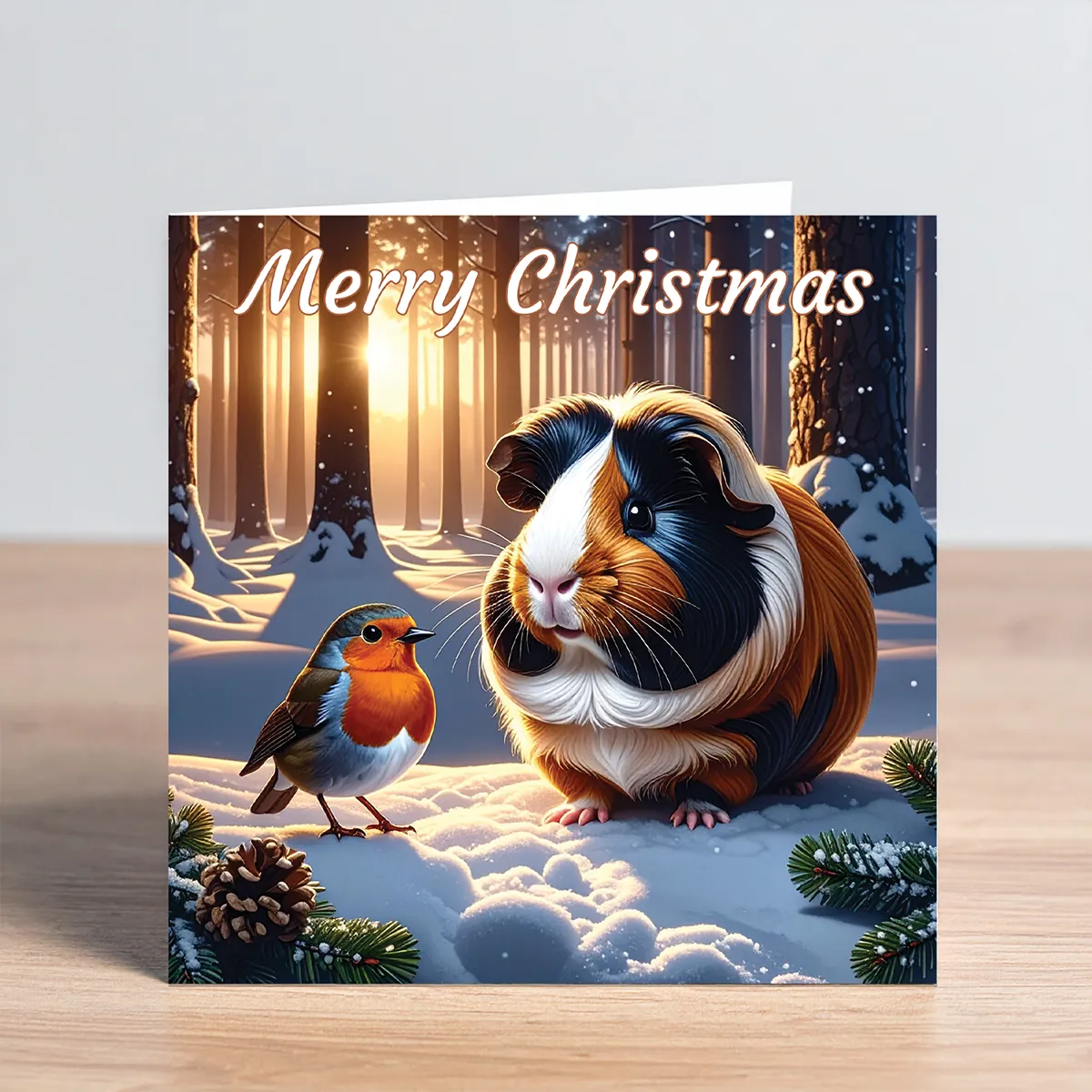 Send Christmas greetings with this adorable Guinea Pig Christmas Card featuring a charming guinea pig in a snowy festive forest. Set against a beautiful backdrop of tall winter trees and soft golden sunset light, this delightful scene captures the peaceful magic of the season. The guinea pig sits in the snow beside a friendly robin, making this Guinea Pig Christmas Card a perfect choice for anyone who loves cute and heart-warming Christmas designs.