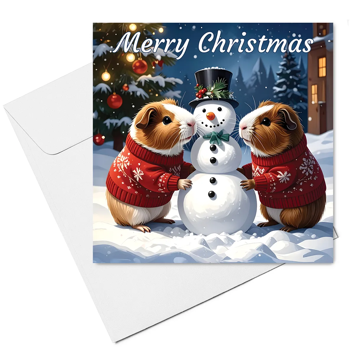 Send Christmas greetings with this adorable Guinea Pig Christmas Card featuring two guinea pigs building a snowman together. Dressed in cosy red jumpers with white snowflake patterns, the guinea pigs add the final touches to their cheerful snowman, complete with a carrot nose, button eyes, and a top hat. Set against a snowy winter scene with a glowing Christmas tree and softly lit cottage, this heartwarming guinea pig Christmas design captures the magic and joy of the season.