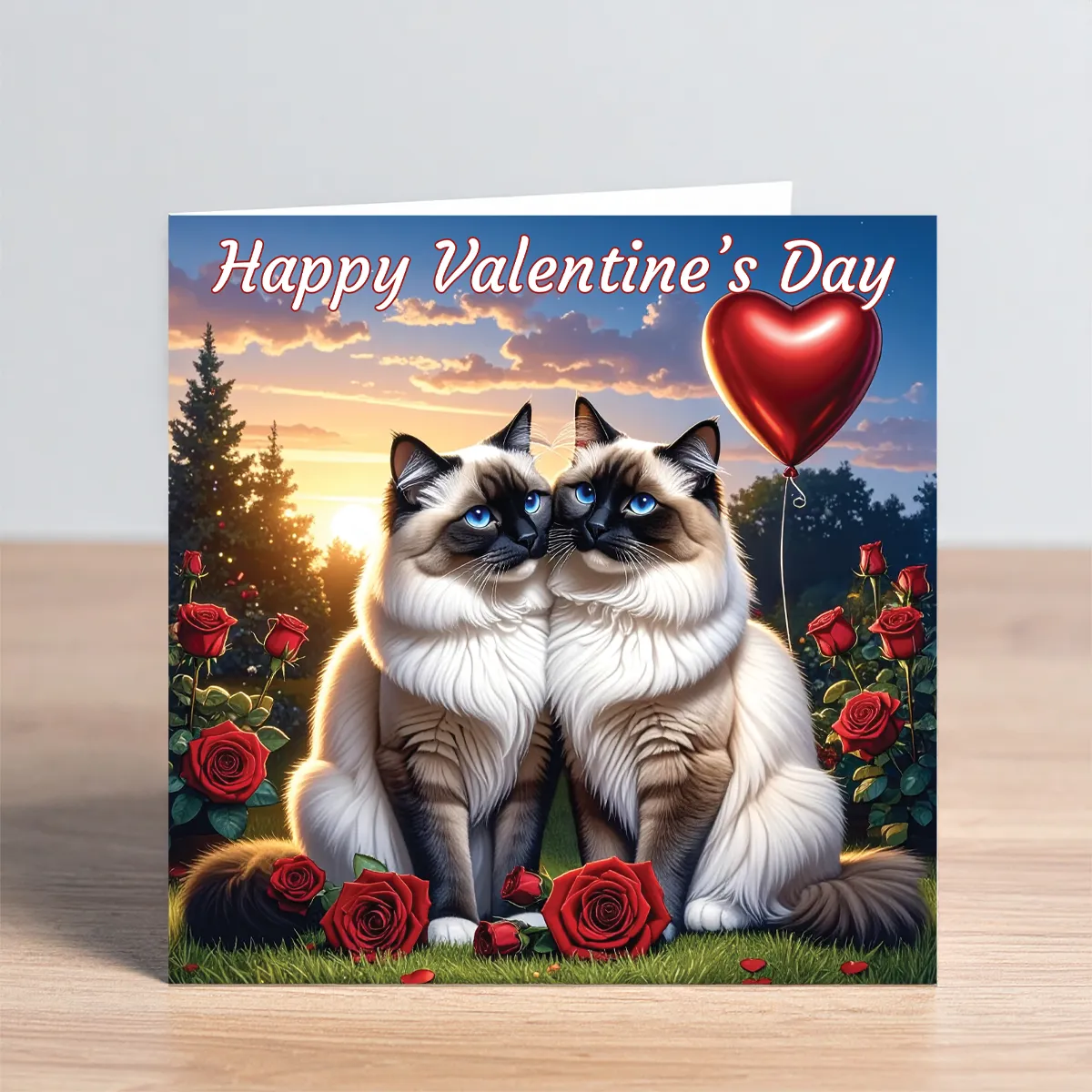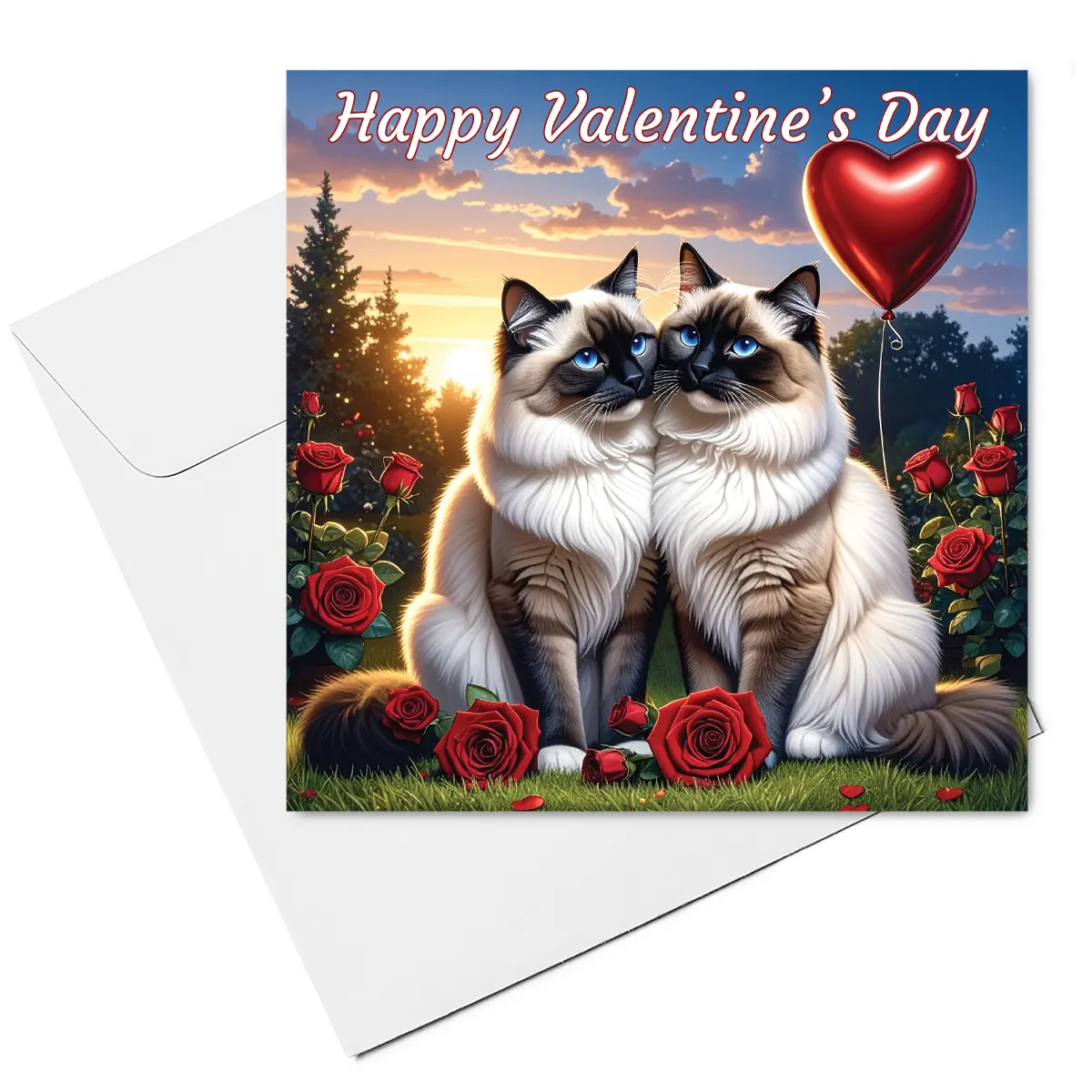 Celebrate love with this charming Cat Valentine’s Day Card featuring two ragdoll cats with striking blue eyes sitting closely together among red roses as the sun sets behind them. A red heart-shaped balloon floats gently at their side, and the warm evening sky fading from gold to soft blue gives this Ragdoll Cat Valentine’s Day Card a beautifully romantic atmosphere.