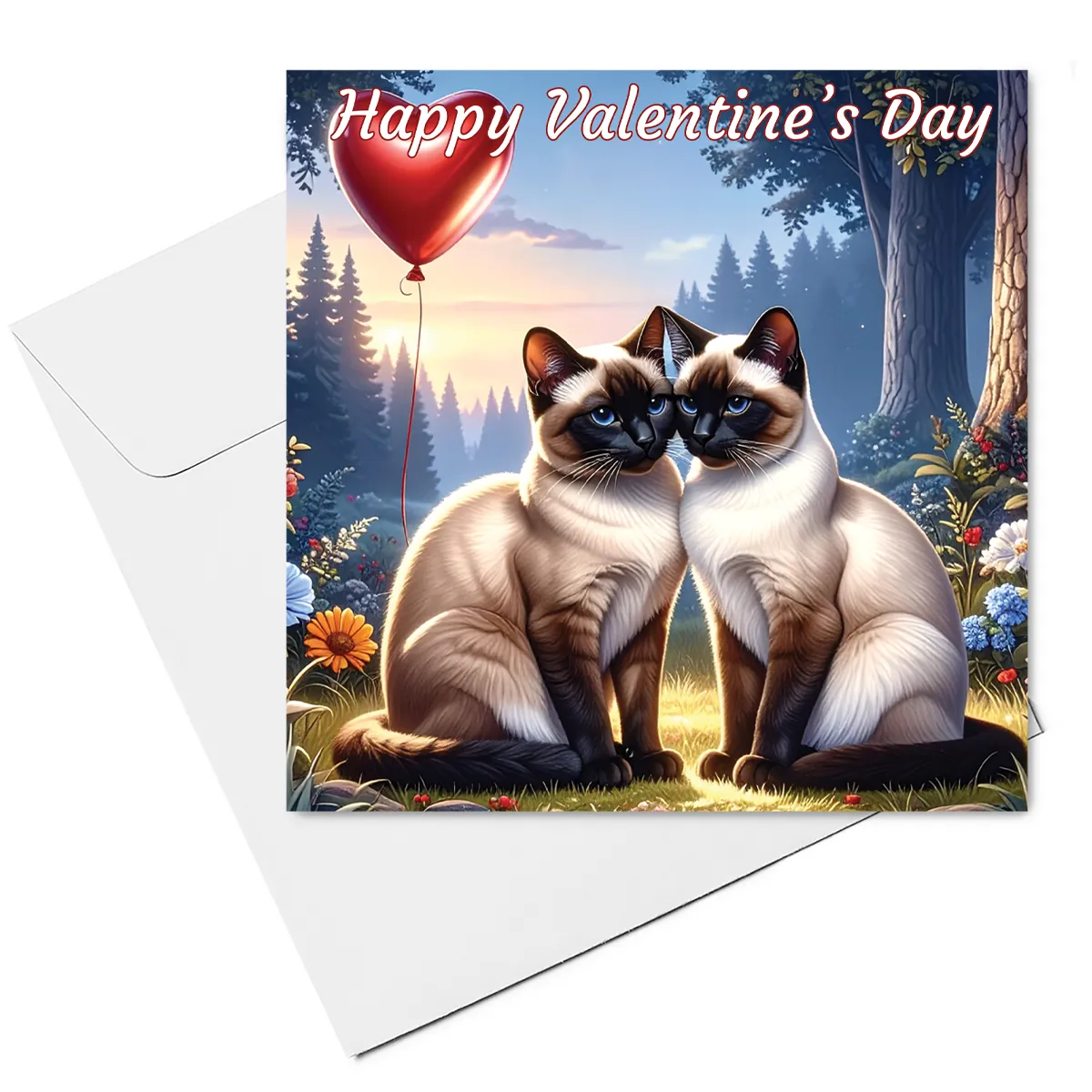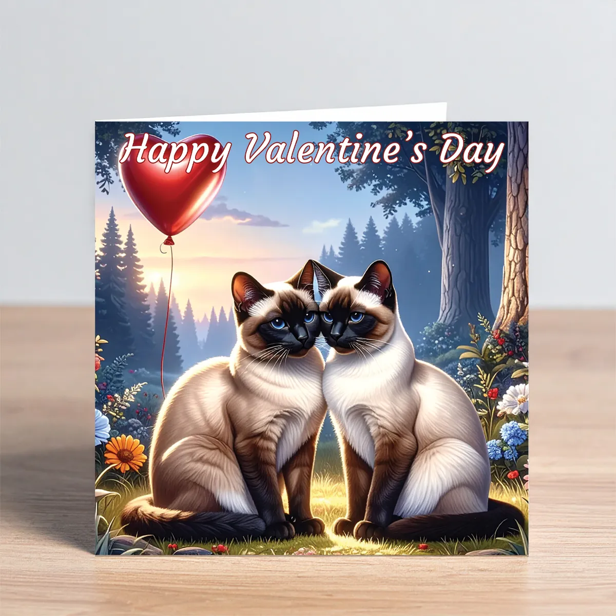Celebrate love with this elegant Cat Valentine’s Day Card featuring two Siamese cats sitting closely together in a romantic woodland clearing with a red heart-shaped balloon floating above them. Surrounded by trees, flowers, and the soft glow of sunset, this Cat Valentine’s Day Card creates a dreamy and affectionate scene that perfectly captures the spirit of Valentine’s Day.